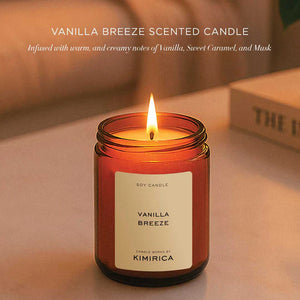 Allow the warm and alluring fragrance of our Vanilla Breeze Soy Candle to uplift your mood and soothe your spirit. A proven mood-booster, the sweet, rich scent of Vanilla is an aromatherapy staple because of its remarkable stress-relieving capabilities. So elevate your home aesthetics and your spirits with our beautiful, hand-poured soy wax candle in classic amber jars, and feel happy and relaxed all day.
